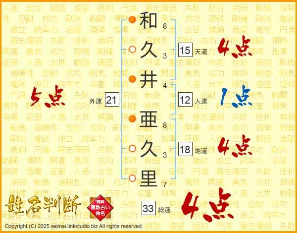 和(8画)久(3画)井(4画) 亜(8画)久(3画)里(7画)