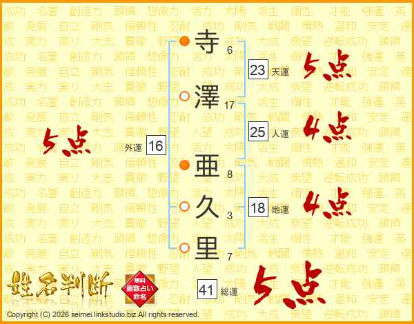 寺澤亜久里さんの天運は23画の5点!