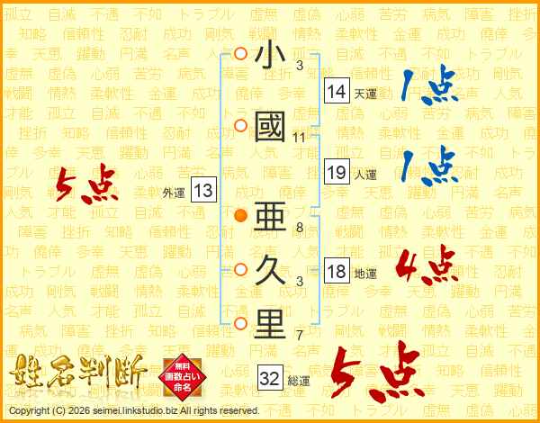 小國亜久里さんの総運は32画の5点!