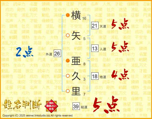 横(16画)矢(5画) 亜(8画)久(3画)里(7画)