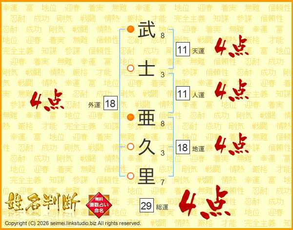 武(8画)士(3画) 亜(8画)久(3画)里(7画)