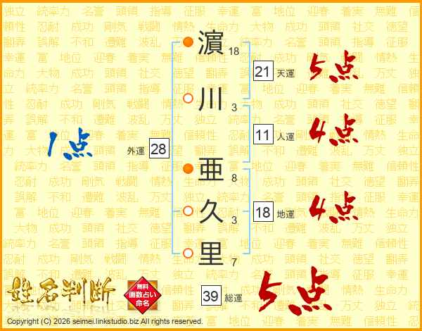 濵(18画)川(3画) 亜(8画)久(3画)里(7画)