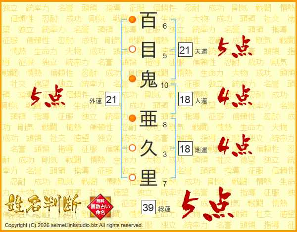 百目鬼亜久里さんの総運は39画の5点!