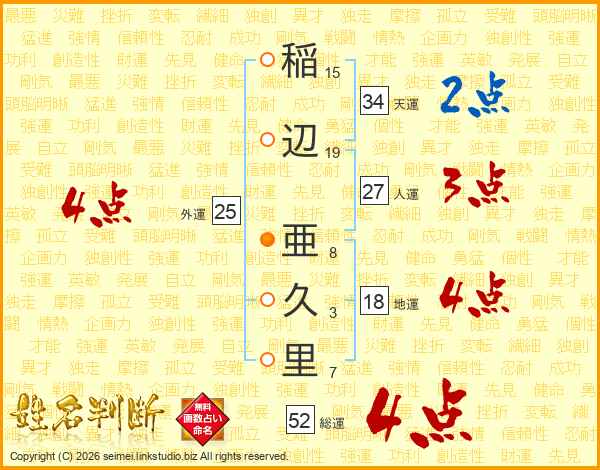 稲(15画)辺(19画) 亜(8画)久(3画)里(7画)