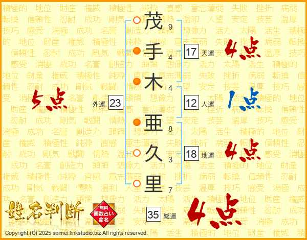 茂(9画)手(4画)木(4画) 亜(8画)久(3画)里(7画)