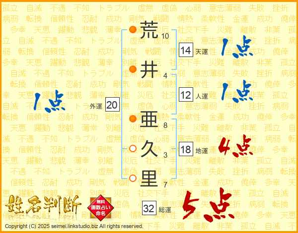 荒(10画)井(4画) 亜(8画)久(3画)里(7画)