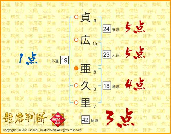 貞(9画)広(15画) 亜(8画)久(3画)里(7画)