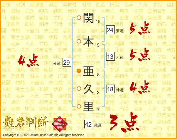 関(19画)本(5画) 亜(8画)久(3画)里(7画)