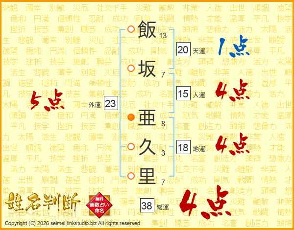 飯(13画)坂(7画) 亜(8画)久(3画)里(7画)