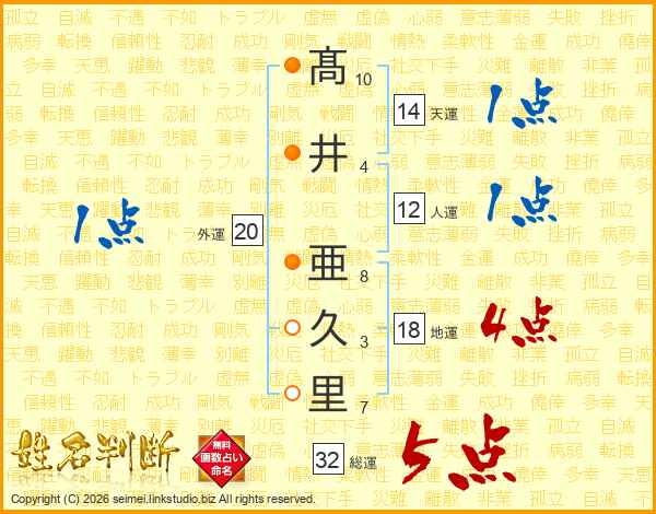髙井亜久里さんの総運は32画の5点!