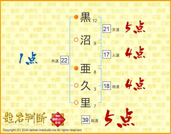 黒(12画)沼(9画) 亜(8画)久(3画)里(7画)