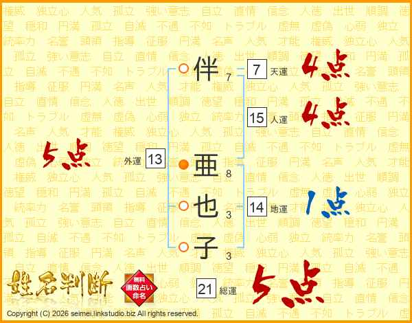 伴亜也子さんの総運は21画の5点!