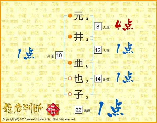 元(4画)井(4画) 亜(8画)也(3画)子(3画)