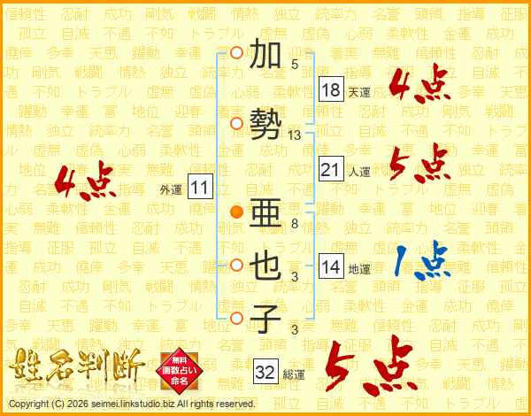 加(5画)勢(13画) 亜(8画)也(3画)子(3画)