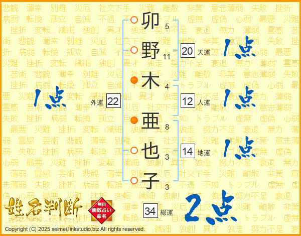 卯(5画)野(11画)木(4画) 亜(8画)也(3画)子(3画)
