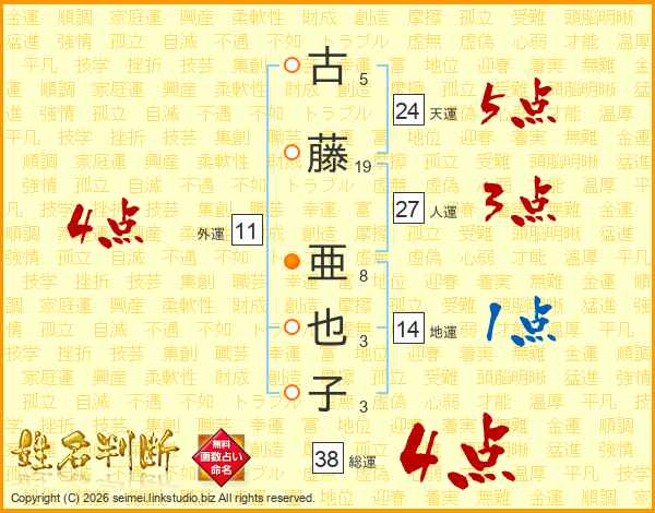 古(5画)藤(19画) 亜(8画)也(3画)子(3画)