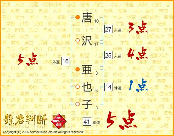 唐(10画)沢(17画) 亜(8画)也(3画)子(3画)