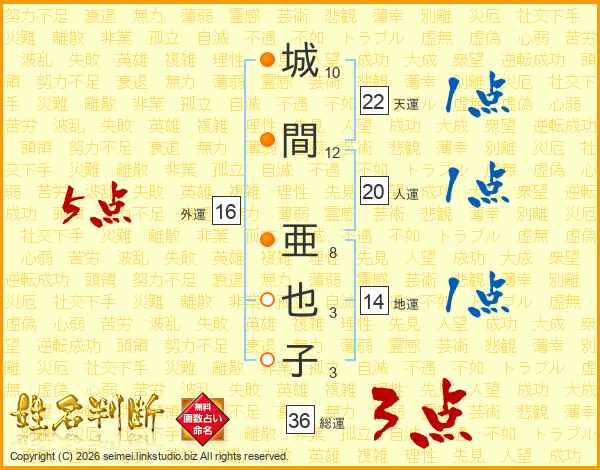 城(10画)間(12画) 亜(8画)也(3画)子(3画)
