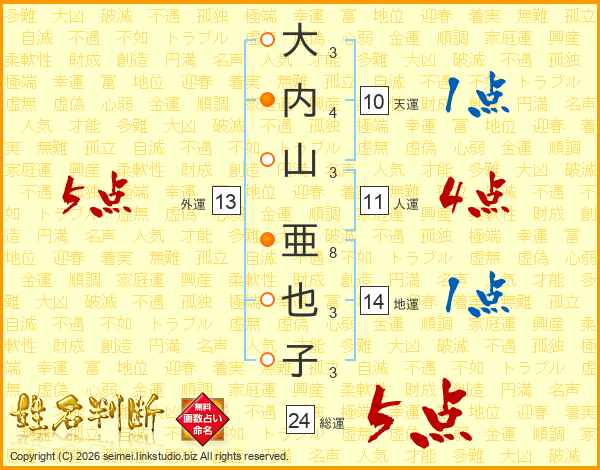 大(3画)内(4画)山(3画) 亜(8画)也(3画)子(3画)