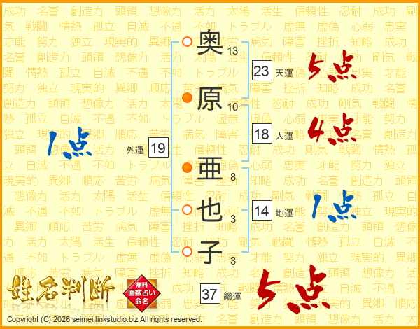 奥(13画)原(10画) 亜(8画)也(3画)子(3画)
