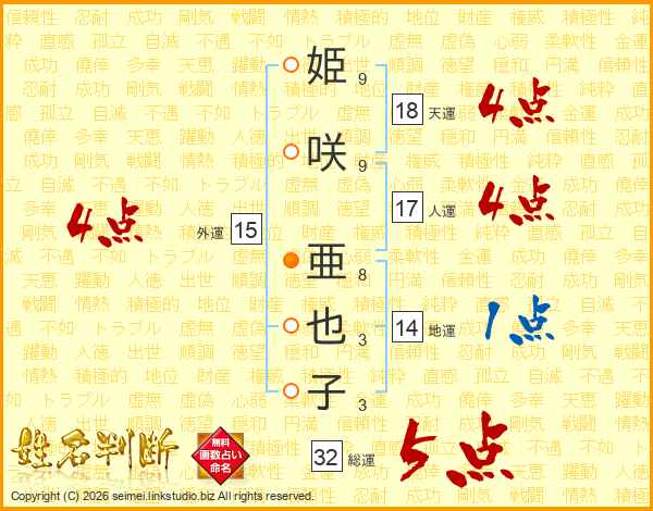 姫咲亜也子さんの総運は32画の5点!