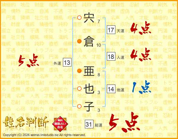 宍倉亜也子さんの総運は31画の5点!