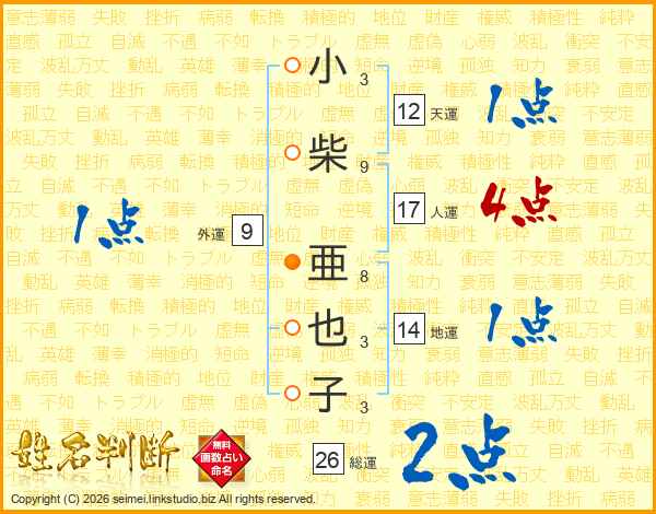 小柴亜也子さんの総運は26画の2点!