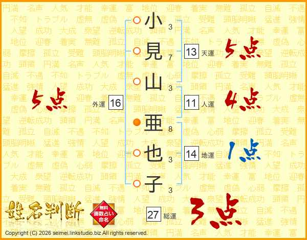 小(3画)見(7画)山(3画) 亜(8画)也(3画)子(3画)