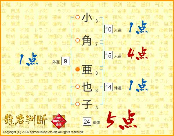小(3画)角(7画) 亜(8画)也(3画)子(3画)