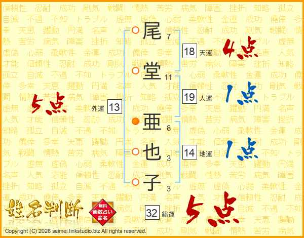 尾堂亜也子さんの総運は32画の5点!
