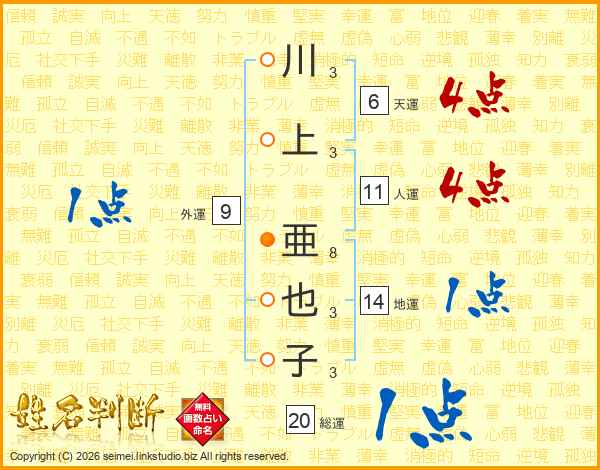 川(3画)上(3画) 亜(8画)也(3画)子(3画)