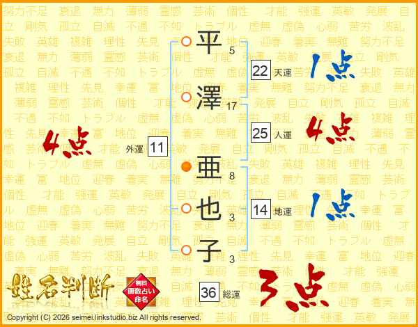 平(5画)澤(17画) 亜(8画)也(3画)子(3画)