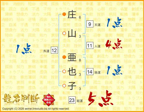 庄(6画)山(3画) 亜(8画)也(3画)子(3画)