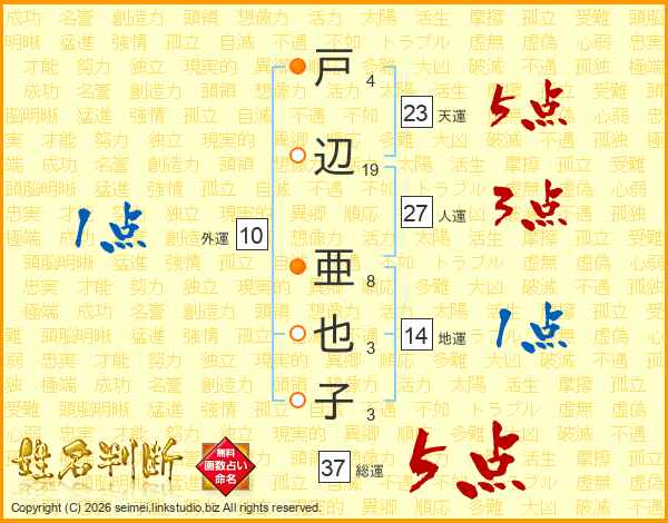 戸辺亜也子さんの総運は37画の5点!