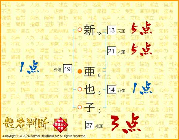 新(13画) 亜(8画)也(3画)子(3画)