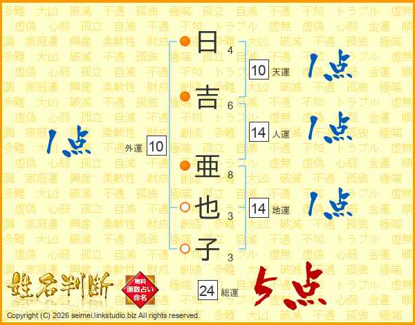 日(4画)吉(6画) 亜(8画)也(3画)子(3画)