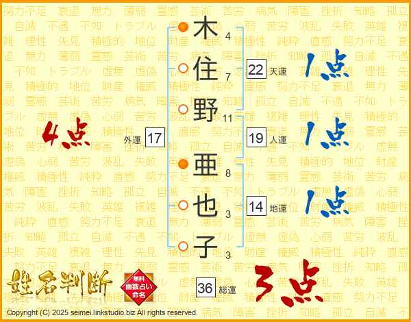 木(4画)住(7画)野(11画) 亜(8画)也(3画)子(3画)
