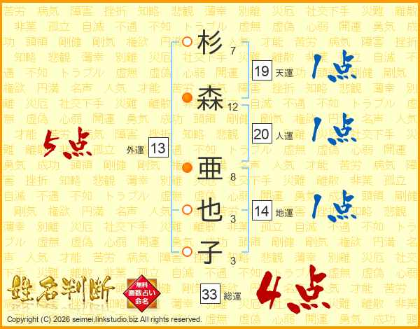 杉(7画)森(12画) 亜(8画)也(3画)子(3画)