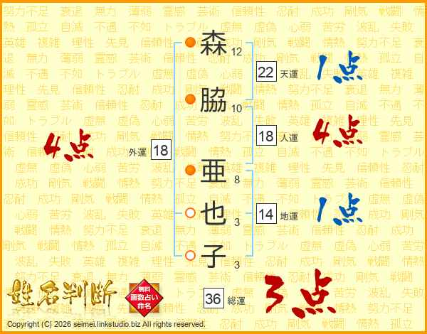 森(12画)脇(10画) 亜(8画)也(3画)子(3画)
