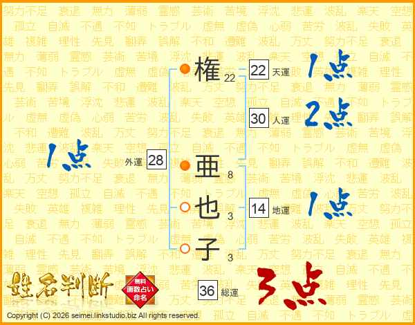 権(22画) 亜(8画)也(3画)子(3画)