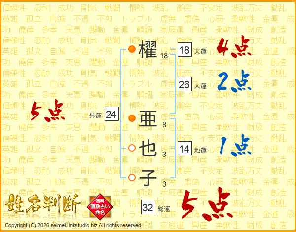 櫂(18画) 亜(8画)也(3画)子(3画)