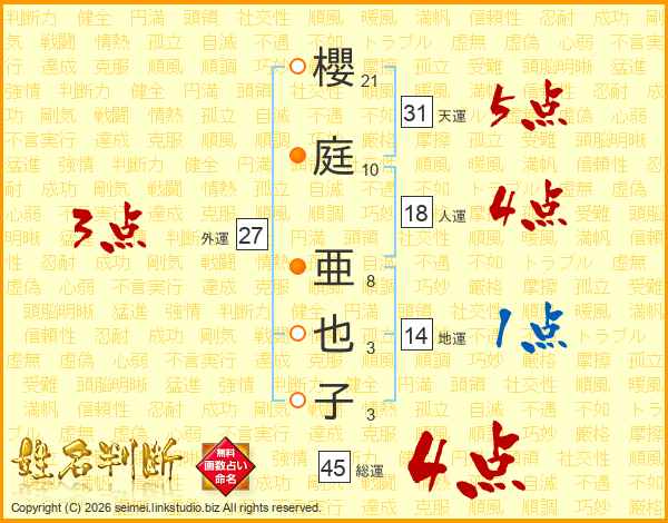 櫻庭亜也子さんの総運は45画の4点!