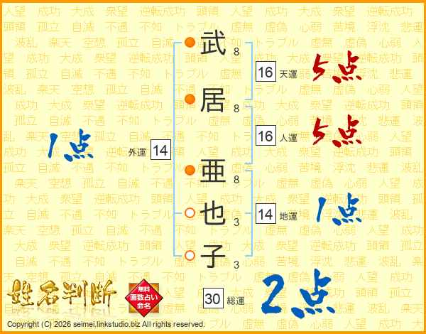 武(8画)居(8画) 亜(8画)也(3画)子(3画)