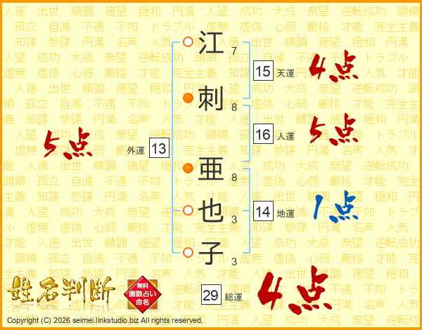 江(7画)刺(8画) 亜(8画)也(3画)子(3画)