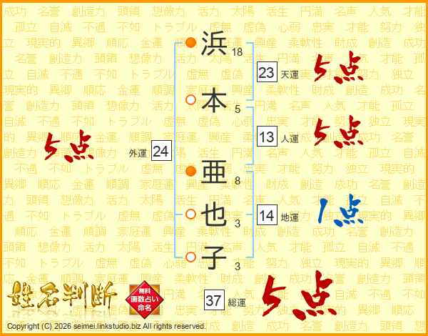 浜(18画)本(5画) 亜(8画)也(3画)子(3画)