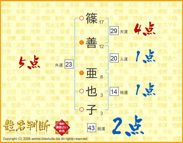 篠善亜也子さんの総運は43画の2点!