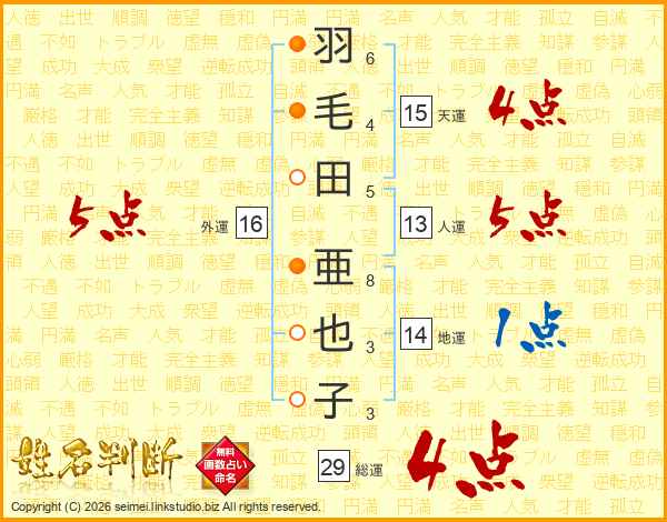 羽(6画)毛(4画)田(5画) 亜(8画)也(3画)子(3画)