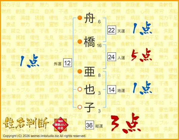 舟(6画)橋(16画) 亜(8画)也(3画)子(3画)