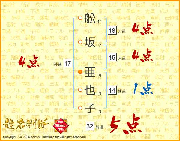 舩坂亜也子さんの総運は32画の5点!