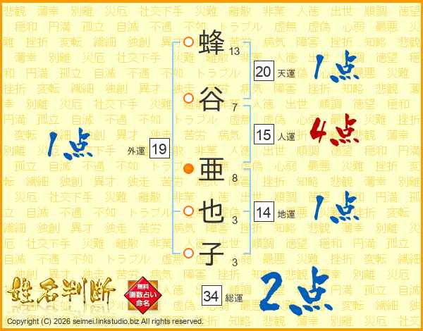 蜂(13画)谷(7画) 亜(8画)也(3画)子(3画)